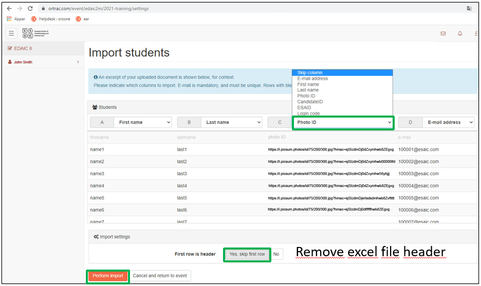 - Import list of students (ladda ned exempelfilen och hitta den på din dator)